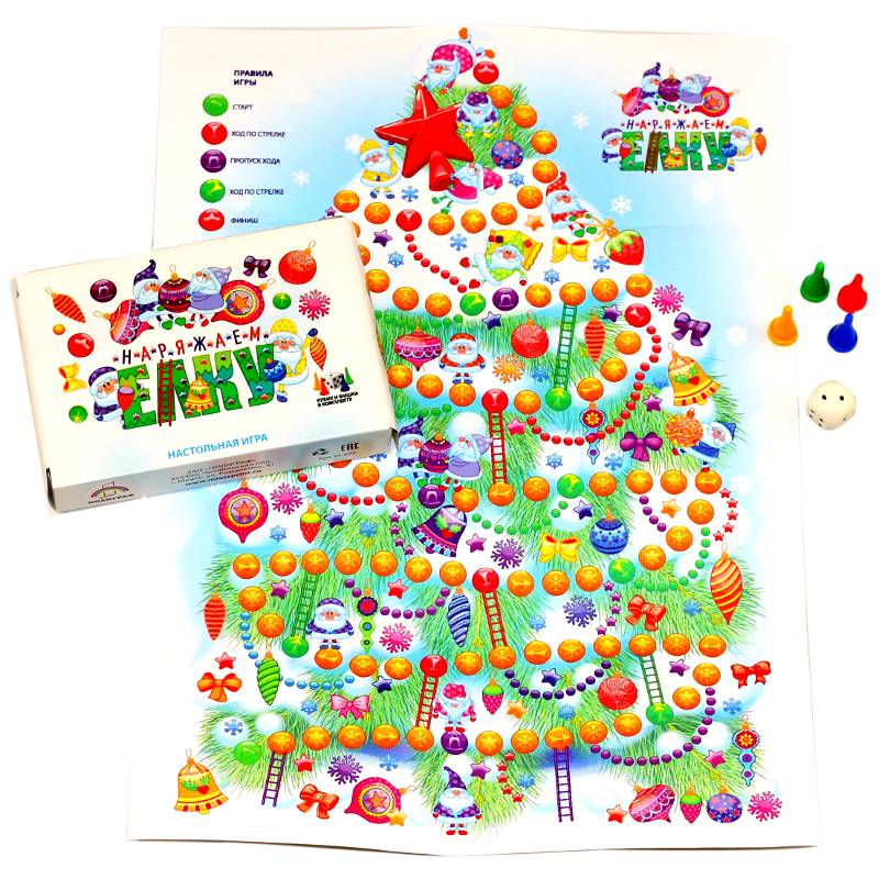В комплекте: игровое поле из плотной бумаги, 4 фишки и кубик.