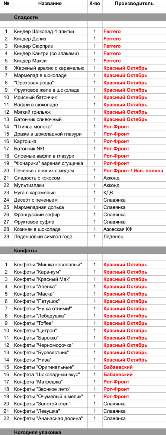 Жареный арахис с карамелью (1 шт), Мармелад в шоколаде (1 шт), "Ореховая роща" (1 шт), Фруктовое желе в шоколаде (1 шт), Ирисный батончик (1 шт), Вафли в шоколаде (1 шт), Мягкий грильяж (1 шт), Батончик сливочный (1 шт), Конфеты "Мишка косолапый" (1 шт), Конфеты "Кара-кум" (1 шт), Конфеты "Красный Мак" (1 шт), Конфеты "Аленка" (1 шт), Конфеты "Маска" (1 шт), Конфеты "Петушок" (1 шт), Конфеты "Ну-ка отними!" (1 шт), Конфеты "Лебедушка" (1 шт), Конфеты "Toffee" (1 шт), Конфеты "Цитрон" (1 шт), Конфеты "Барокко" (1 шт), Конфеты "Черноморочка" (1 шт), Конфеты "Буревестник" (1 шт), Конфеты "Нива" (1 шт)