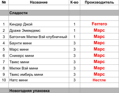 Драже Эмемдемс (1 шт), Батончик Милки Вэй клубничный (1 шт), Баунти мини (3 шт), Марс мини (3 шт), Сникерс мини (3 шт), Твикс мини (3 шт), Милки Вэй мини (3 шт), Твикс имбирь мини (3 шт)